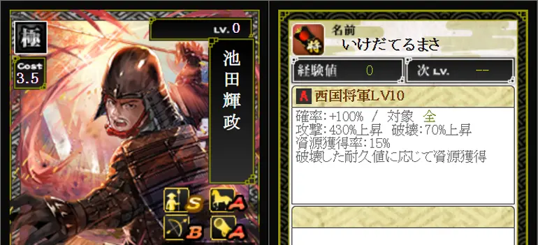 向井正綱 No.2472 戦国IXA2023年11月の追加武将 卓越発動で攻撃効果が3倍と飛翔を得るスキルを持つ武将カードです。