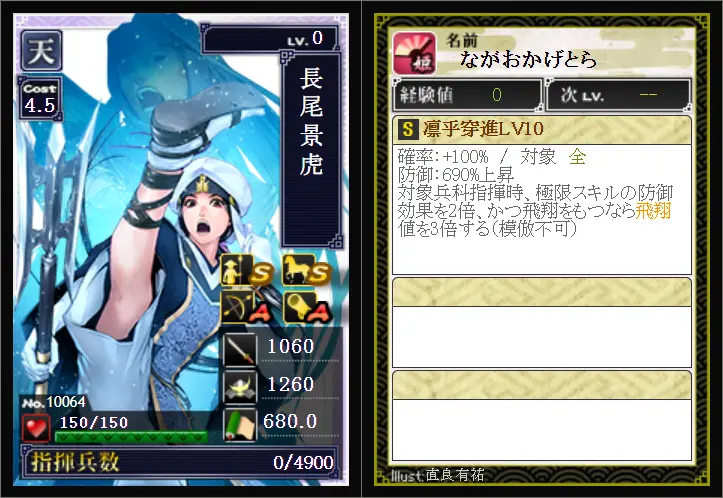 対象兵科指揮時、極限スキルの防御効果を2倍、かつ飛翔をもつなら飛翔値を1.1倍する(模倣不可)