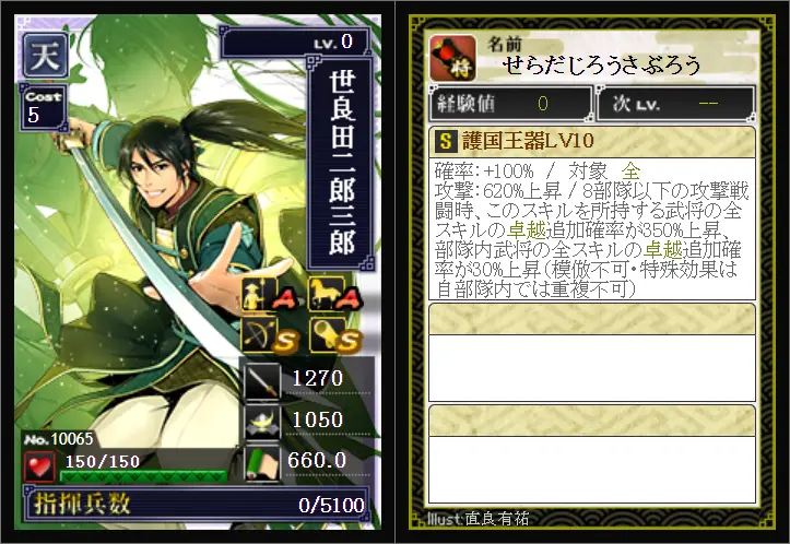 攻撃:1730%上昇 / 8部隊以下の攻撃戦闘時、このスキルを所持する武将の全スキルの卓越追加確率が450%上昇、部隊内武将の全スキルの卓越追加確率が45%上昇(模倣不可・特殊効果は自部隊内では重複不可)